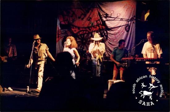 This is a colour photograph of Johannes Kerkorrel en die Gereformeerde Blues Band (Willem Möller, Dagga-Dirk Uys, Tonia Selley, Bernoldus Niemand, Piet Pers) performing on stage during a Voëlvry concert, May 1989. This photograph forms part of a series of snapshots taken during the Voëlvry tour. Digitised by the South African History Archive (SAHA) in 2014. Included in the SAHA physical and/or virtual exhibitions 'What you won't hear on the radio', developed to mark the 30th birthday of Shifty Records and the 25th anniversary of the Voëlvry tour. |