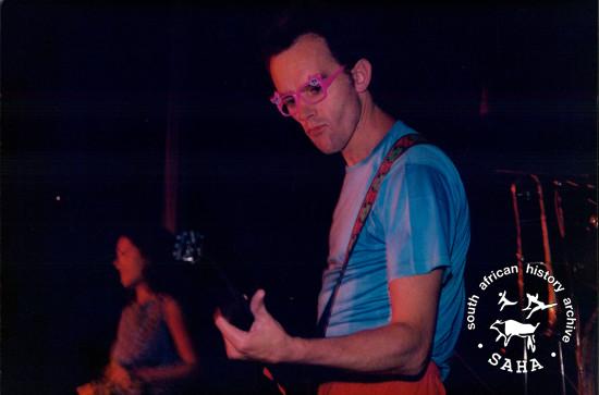 This is a colour photograph of Gary Herselman (Piet Pers) performing on stage during a Voëlvry concert, May 1989. This photograph forms part of a series of snapshots taken during the Voëlvry tour. Digitised by the South African History Archive (SAHA) in 2014. Included in the SAHA physical and/or virtual exhibitions 'What you won't hear on the radio', developed to mark the 30th birthday of Shifty Records and the 25th anniversary of the Voëlvry tour. |