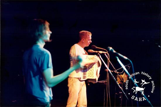 This is a colour photograph of Johannes Kerkorrel and Jannie 'Hanepoot' van Tonder performing on stage during a Voëlvry concert, May 1989. This photograph forms part of a series of snapshots taken during the Voëlvry tour. Digitised by the South African History Archive (SAHA) in 2014. Included in the SAHA physical and/or virtual exhibitions 'What you won't hear on the radio', developed to mark the 30th birthday of Shifty Records and the 25th anniversary of the Voëlvry tour. |