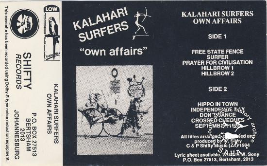This is the cover for the Low Budgie Cassettes release of the Kalahari Surfers' 'Own Affairs' as part of a low budget series released by Shifty Records. Digitised by the South African History Archive (SAHA) in 2014. Included in the SAHA physical and virtual exhibitions 'What you won't hear on the radio', developed to mark the 30th birthday of Shifty Records and the 25th anniversary of the Voƫlvry tour. A link to the 'Own Affairs' digital album on Bandcamp, an online music store is included. |