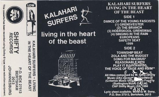 This is the cover for the Low Budgie Cassettes release of the Kalahari Surfers' 'Living in the Heart of the Beast' as part of a low budget series released by Shifty Records. Digitised by the South African History Archive (SAHA) in 2014. Included in the SAHA physical and virtual exhibitions 'What you won't hear on the radio', developed to mark the 30th birthday of Shifty Records and the 25th anniversary of the Voƫlvry tour. A link to the 'Living in the Heart of the Beast' digital album on Bandcamp, an online music store is included. |