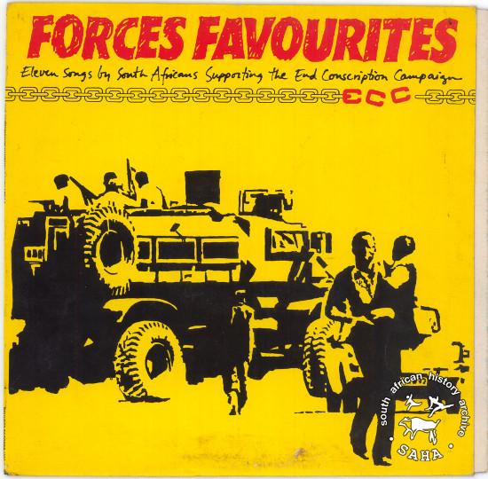 This is the front cover of the LP re-release of the compilation album 'Forces Favourites' by Rounder Records in Massachusetts in 1986. The album was originally released by Shifty Records in conjunction with the End Conscription Campaign (ECC) in December 1985. The cover was designed in Canada. Digitised by Specialised Archival Solutions in 2014. Included in the SAHA physical and virtual exhibitions 'What you won't hear on the radio', developed to mark the 30th birthday of Shifty Records and the 25th anniversary of the Voƫlvry tour. A link to the 'Forces Favourites' digital album on Bandcamp, an online music store is included. |
