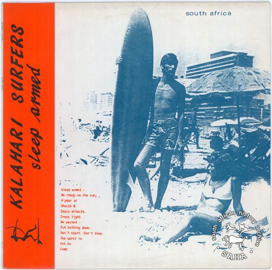 This is the front cover of the Shifty Records LP release 'Sleep Armed' by the Kalahari Surfers in 1987. The cover was designed by Umhlanga Roxx. Digitised by Specialised Archival Solutions in 2014. Included in the SAHA physical and virtual exhibitions 'What you won't hear on the radio', developed to mark the 30th birthday of Shifty Records and the 25th anniversary of the Voƫlvry tour. A link to the 'Sleep Armed' digital album on Bandcamp, an online music store is included. |