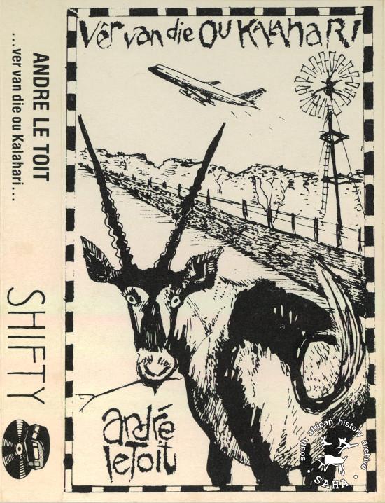 This is the cover for the cassette only release of André Letoit's 'Ver van die Ou Kalahari', released by Shifty Records, May 1987. Digitised by the South African History Archive (SAHA) in 2014. Included in the SAHA physical and virtual exhibitions 'What you won't hear on the radio', developed to mark the 30th birthday of Shifty Records and the 25th anniversary of the Voëlvry tour. A link to the 'Ver van die Ou Kalahari' digital album on Bandcamp, an online music store is included. |