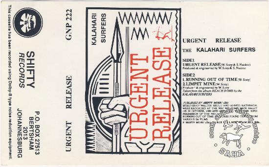 This is the cover for the Shifty Records cassette release 'Urgent Release' by the Kalahari Surfers, 1990. Included in the SAHA physical and virtual exhibitions 'What you won't hear on the radio', developed to mark the 30th birthday of Shifty Records and the 25th anniversary of the Voƫlvry tour. |