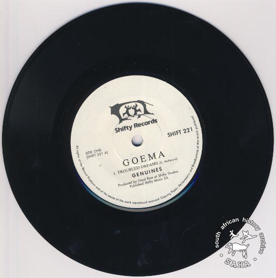 This is side one of the 7-inch single 'Troubled Dreams' by the Genuines from their album 'Goema', released by Shifty Records in 1986. Digitised by Specialised Archival Solutions in 2014. Included in the SAHA physical and virtual exhibitions 'What you won't hear on the radio', developed to mark the 30th birthday of Shifty Records and the 25th anniversary of the Voƫlvry tour. |