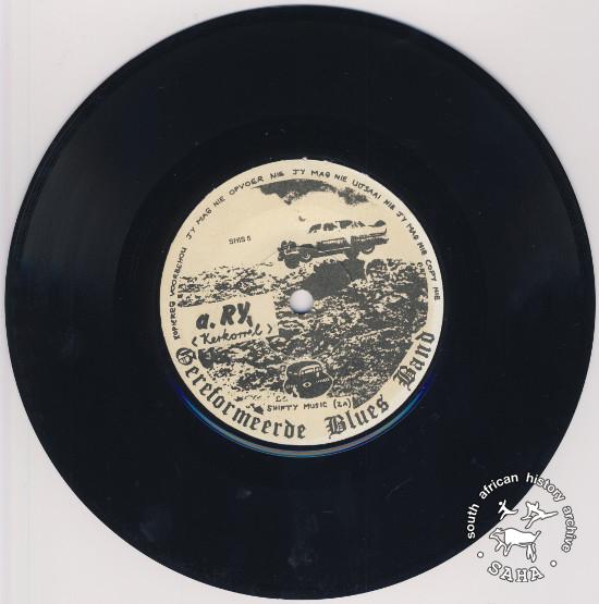 This is side one of the 7-inch single 'Ry' by Johannes Kerkorrel en die Gereformeerde Blues Band, released by Shifty Records in 1988. Digitised by Specialised Archival Solutions in 2014. Included in the SAHA physical and virtual exhibitions 'What you won't hear on the radio', developed to mark the 30th birthday of Shifty Records and the 25th anniversary of the Voƫlvry tour. |