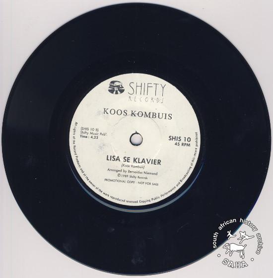 This is side two of the 7-inch single 'Lisa se Klavier' by Koos Kombuis, released by Shifty Records in 1989. The 7-inch single was released as a promotional record. Digitised by Specialised Archival Solutions in 2014. Included in the SAHA physical and virtual exhibitions 'What you won't hear on the radio', developed to mark the 30th birthday of Shifty Records and the 25th anniversary of the Voƫlvry tour. |
