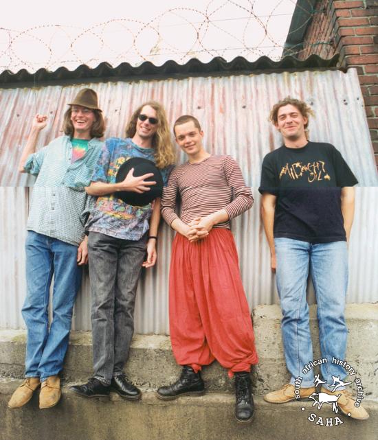 This is a colour photograph of Urban Creep band members Chris Letcher, Ross Campbell, Brendan Jury and Didier Noblier; photographer and date unknown. A digital image was provided to SAHA by Ross Campbell. Included in the SAHA physical and/or virtual exhibitions 'What you won't hear on the radio', developed to mark the 30th birthday of Shifty Records and the 25th anniversary of the Voƫlvry tour. |