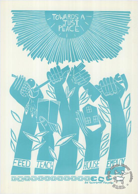This poster is silkscreened blue, produced by the ECC at STP, Johannesburg. This poster outlines the basic demands that would be met in a peaceful society. The text reads “TOWARDS A JUST PEACE: FEED TEACH HOUSE EMPLOY”Digitised by Specialised Archival Solutions in 2009. Reproduced in "Images of Defiance: South African Resistance posters in the 1980s" on page 131 (number 230) of the 1991 SAHA / Ravan Press edition and the 2004 SAHA / STE Publishers edition. It also appears on page 139 of “Red on Black: The Story of the South African Poster Movement”, SAHA / STE Publishers, 2007. |
