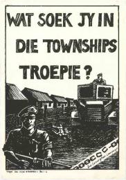 This poster is silkscreened black, produced by the ECC, Johannesburg. This poster questions the existence of the soldiers in townships. The text reads “WAT SOEK JY IN DIE TOWNSHIPS TROEPIE?” Digitised by Specialised Archival Solutions in 2009. Reproduced in "Images of Defiance: South African Resistance posters in the 1980s" on page 135 (number 240) of the 1991 SAHA / Ravan Press edition and the 2004 SAHA / STE Publishers edition. It also appears on page 148 of “Red on Black: The Story of the South African Poster Movement”, SAHA / STE Publishers, 2007 |