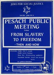 This poster is silkscreened blue with white text, produced for Jews for Social Justice by the STP in 1986, Johannesburg. This poster advertises a progressive Jewish group holding a meeting to focus on the universal struggle for freedom. The text reads “JEWS FOR SOCIAL JUSTICE invite you to a PESACH PUBLIC MEETING Titled : FROM SLAVERY TO FREEDOM - THEN AND NOW”Digitised by Specialised Archival Solutions in 2009. Reproduced in "Images of Defiance: South African Resistance posters in the 1980s" on page 99 (number 185) of the 1991 SAHA / Ravan Press edition. |