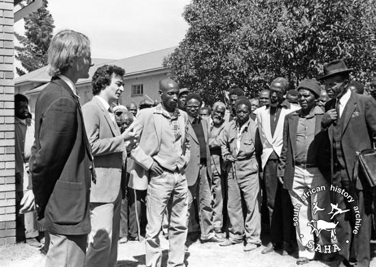 This black and white photograph of Geoff Budlender talking to Driefontein residents outside the court in Volksrust was taken by Gille de Vlieg in 1984. Included in SAHA Land Act Project report, 2014. |