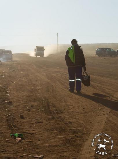 This digital colour image of a mineworker walking home from work in Driefontein was taken by Gille de Vlieg for the SAHA Land Act 1913 Legacy Project in June 2013. Included in SAHA Land Act Project report, 2014. |
