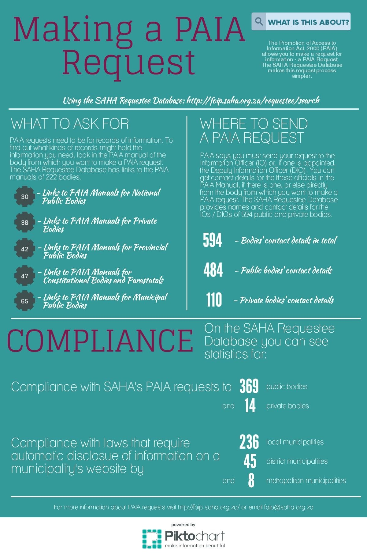 In addition SAHA has shared its experiences in submitting PAIA requests to these public and private bodies by providing statistics about compliance with SAHA's PAIA requests to each of those bodies.
