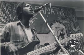 This is a black and white photograph of musician Gito Baloi playing bass guitar at a gig, circa 1986. Photographer is unknown. Gito Baloi was also playing bass and performing backing vocals on Simba Morri's 'Wasamata' album. This photograph was digitised by the South African History Archive (SAHA) in 2014. Included in the SAHA physical and/or virtual exhibitions 'What you won't hear on the radio', developed to mark the 30th birthday of Shifty Records and the 25th anniversary of the Voƫlvry tour. |