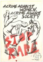 This poster is silkscreened in red and black on white. It features a drawing of a small, naked woman being pulled at by two large hands; the text "STOP RAPE" is done in a stencil-like font on top of the image. The main text reads: "A CRIME AGAINST WOMEN, A CRIME AGAINST SOCIETY". This poster is very similar to poster AL2447_2403.