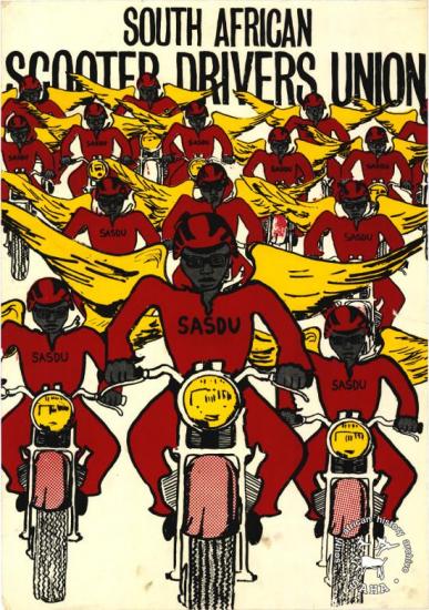 This poster is silkscreened black, yellow and red , drawn by Stephen Rothenburg, graphic design by Morris Smithers and issued by the South African Scooter Drivers Union (SASDU), Johannesburg, in 1984. This poster refers to SASDU taking off.The text reads:"SOUTH AFRICAN SCOOTER DRIVERS UNION". The poster was digitised by Specialised Archival Solutions in 2009.Reproduced in "Images of Defiance: South African Resistance posters in the 1980s" on page 49 (number 75) of the 1991 SAHA / Ravan Press edition and the 2004 SAHA / STE Publishers edition. It also appears on page 115 of “Red on Black: The Story of the South African Poster Movement”, SAHA / STE Publishers, 2007. |